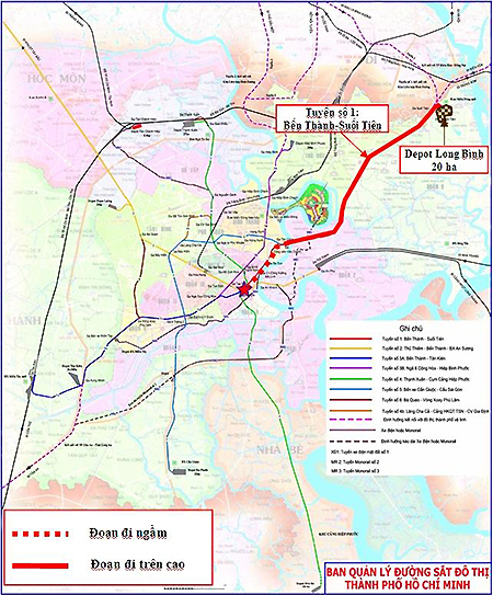 Metro Số 1 dài 19,7 km gồm 14 ga, kéo dài từ Long Bình (quận 9) đến Bến Thành (quận 1) được khởi công vào tháng 8/2012. Hơn 12 km trên cao đã được thông tuyến vào tháng 6/2018. Đoạn ngầm dài 2,6 km gồm gói thầu 1b (2 ga ngầm Nhà hát thành phố và Ba Son) và gói thầu 1a (ga Bến Thành).