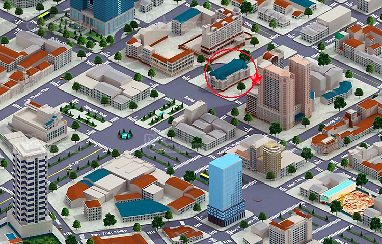 Đoạn tường vây được phá dỡ nằm dưới Nhà hát thành phố (vòng tròn đỏ), nối 2 đoạn ngầm: Nhà hát - Ba Son và Nhà hát - Bến Thành. Ảnh: Diadiem.com |